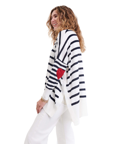 What's your love language? Our Amour sweater says love best with darling little heart appliqués on the sleeves and stripes across the weave. With loose shoulders and signature side slits that move with you, Amour goes where you go—with lots of love and a sophisticated flair of charm and joie de vivre. This faithful sweater is your keeper for all seasons because—let’s face it—love is always in style.